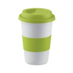 Single walled ceramic mug with silicone lid and wrap band. 400ml capacity. Not suitable for microwave use. Ceramic transfer is dishwasher safe. As this is a single walled mug heat transfer can still occur.