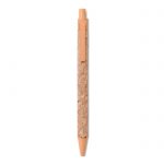 Push button ball pen with cork barrel and Eco-friendly wheat straw (50%) and ABS plastic (50%) fittings. Blue ink. Cork is a natural material, due to its structural nature and surface porosity the final print result per item may have deviations.